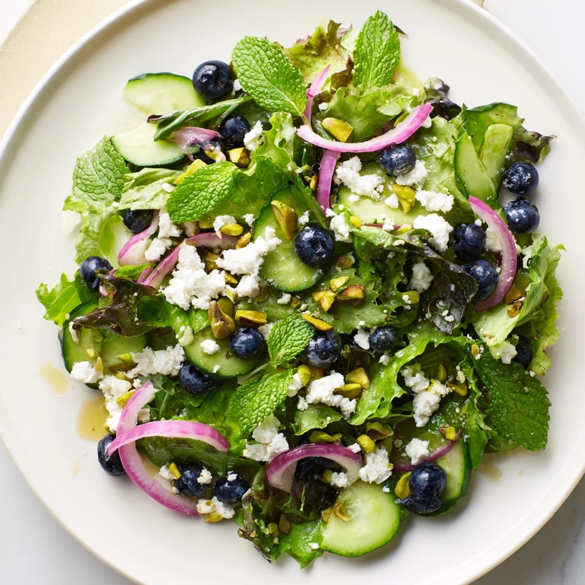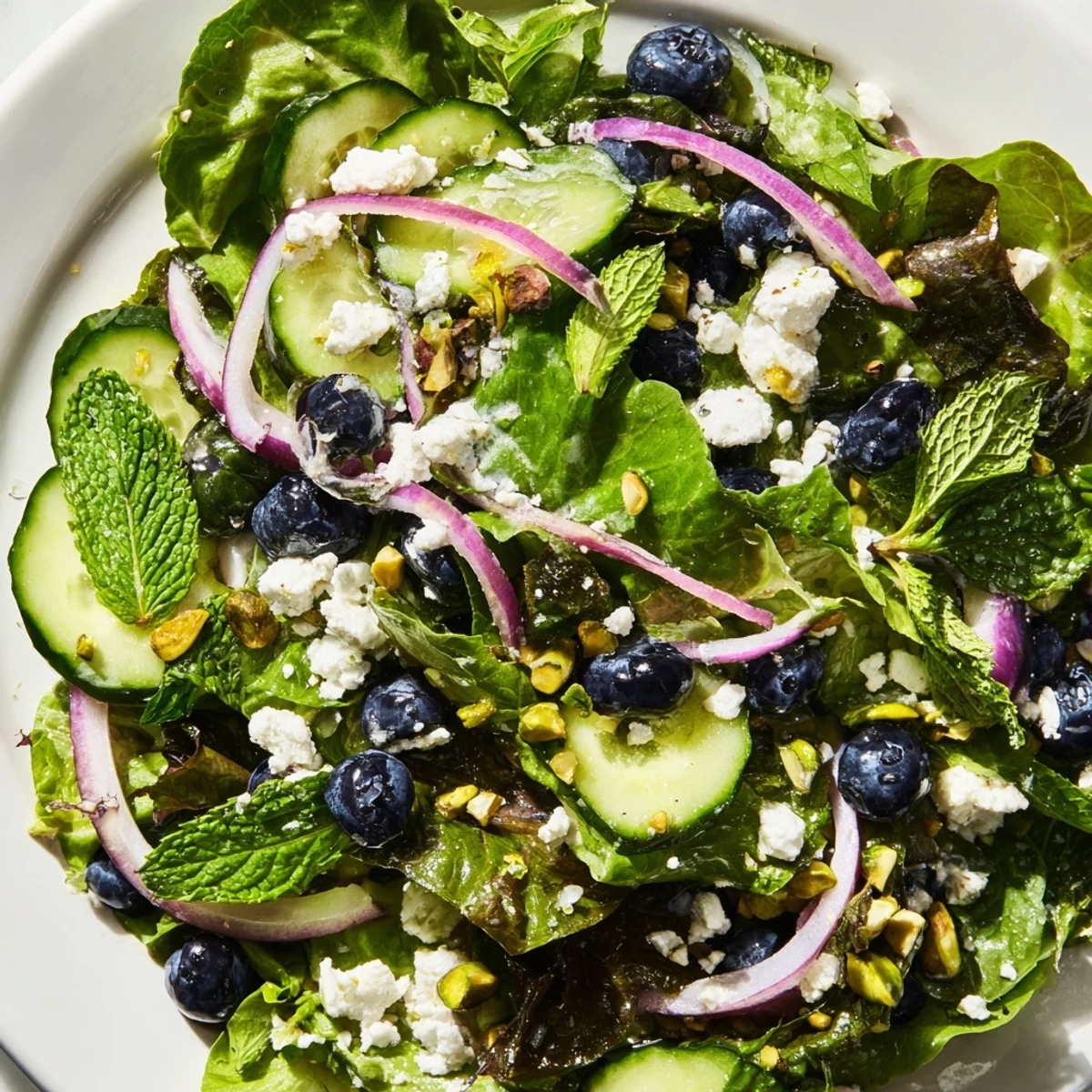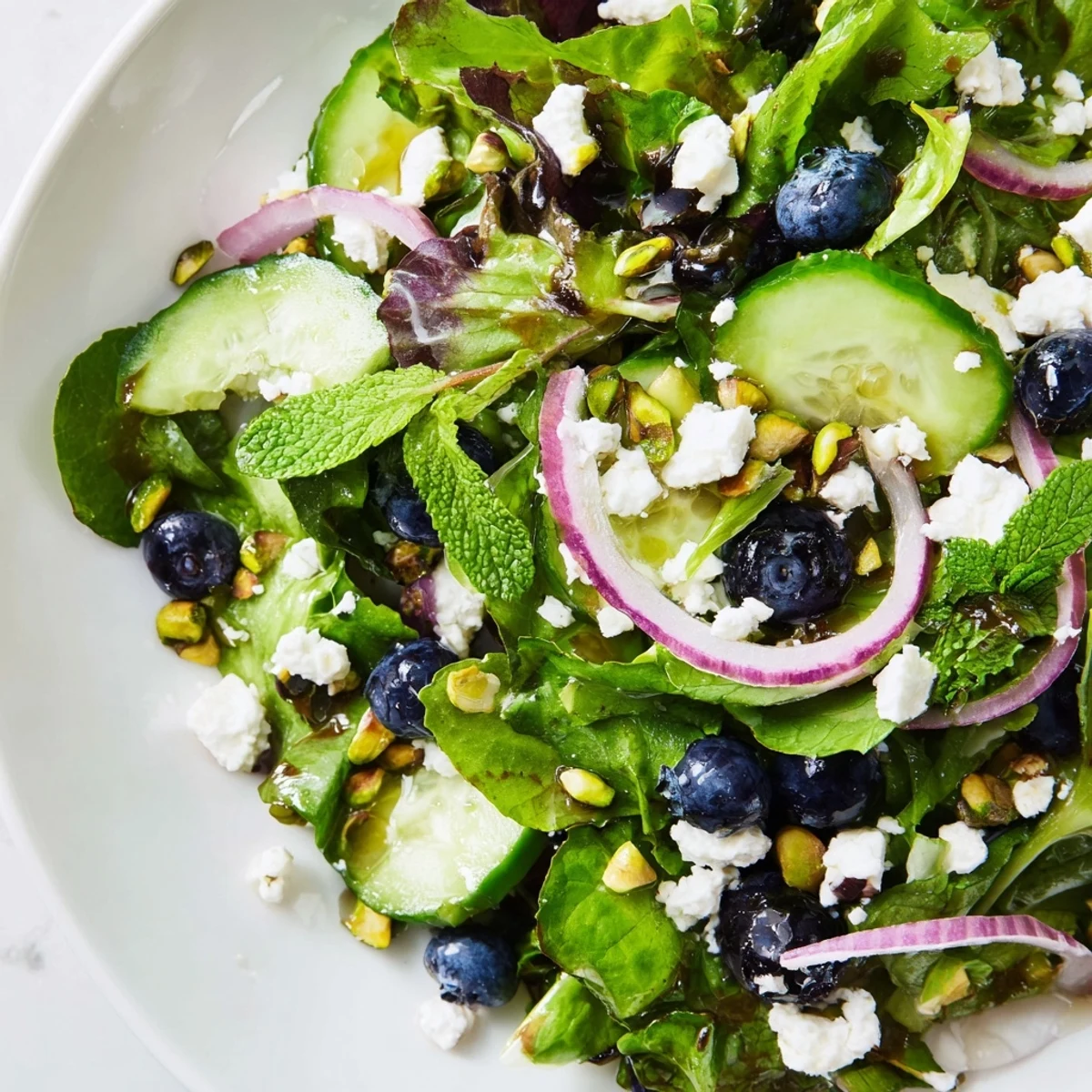 The first time I made this salad was on a whim when my CSA box overflowed with spring greens and fresh mint. I tossed in whatever looked good from the pantry, and somehow blueberries and pistachios ended up in the same bowl. My husband took one bite and asked if this could be our regular Wednesday dinner. Now it is the salad I make when I need something that feels like sunshine on a plate.