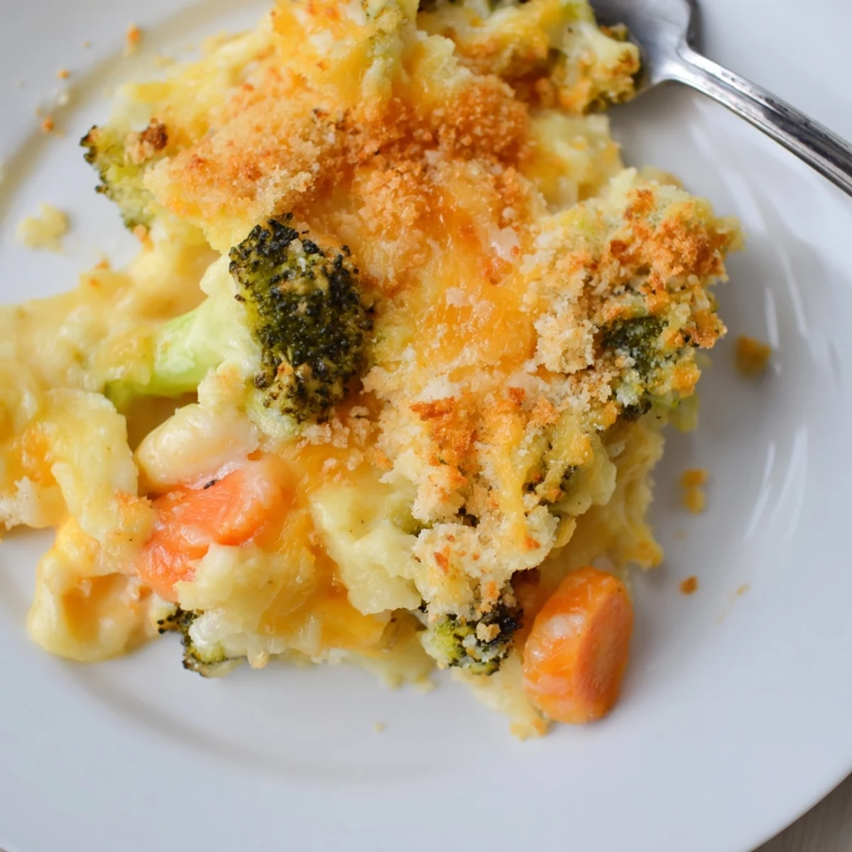 Steam or blanch broccoli and carrots until just tender, then fold into a smooth cheddar sauce made by whisking butter, flour and milk over medium heat. Stir in garlic and onion powders, season, then combine with vegetables in a baking dish. Top with panko mixed with butter and Parmesan, bake until golden and bubbly. Rest briefly before serving; swap cheeses or add nutmeg or cooked protein to vary flavors.
