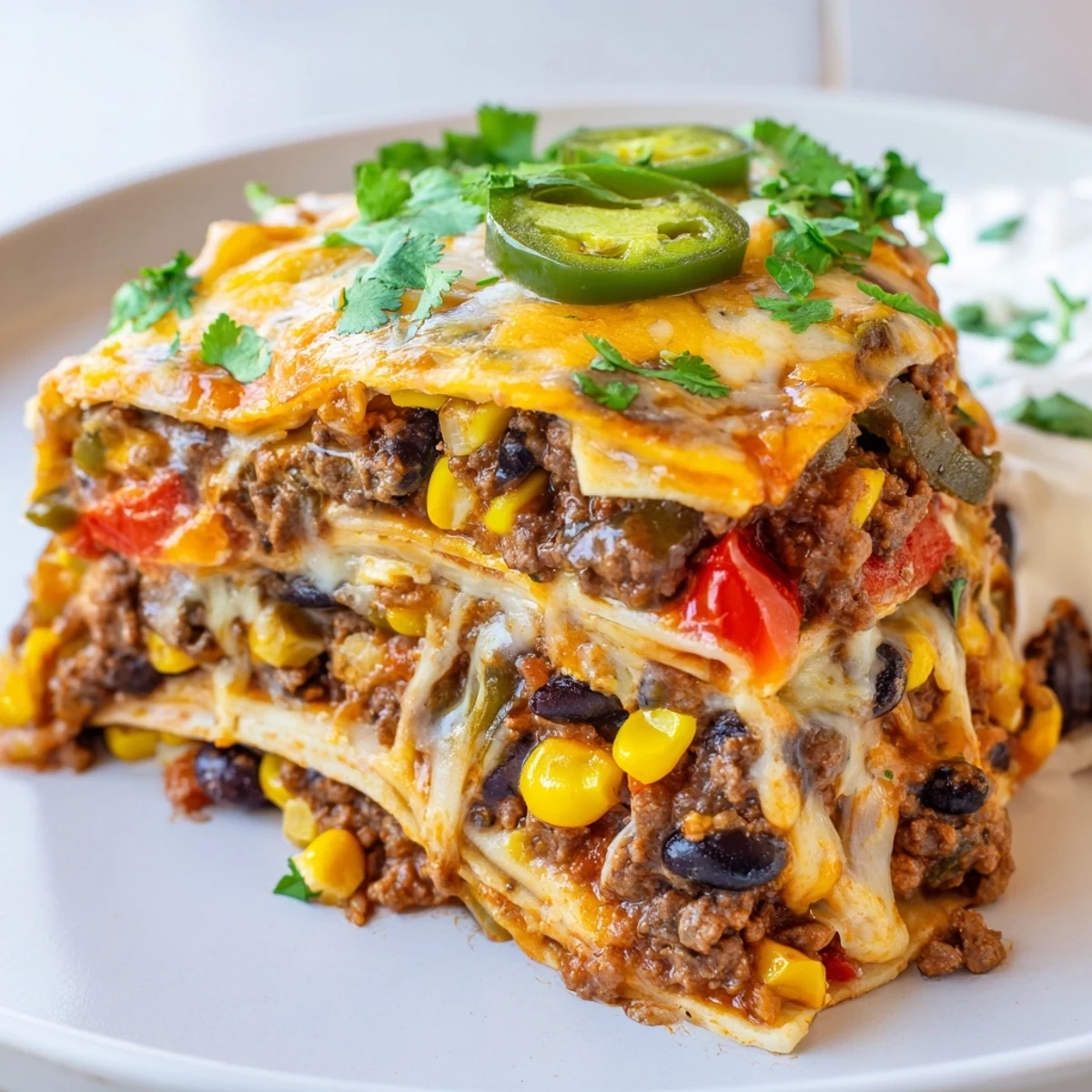 This vibrant Tex-Mex inspired casserole transforms traditional lasagna by swapping pasta for soft flour tortillas. Each layer features perfectly seasoned ground beef with aromatic onions, garlic, and bell peppers, combined with hearty black beans and sweet corn. The meat mixture simmers in zesty diced tomatoes with taco seasoning, creating a rich, flavorful sauce that soaks into the tortillas as it bakes. Assembled in three generous layers and topped with a generous blanket of shredded Mexican cheese blend, this dish emerges from the oven bubbling and golden. After a brief resting period, the layers hold together beautifully when sliced. Customize with fresh cilantro, jalapeños, or cool sour cream to balance the warmth. Perfect for feeding a family or meal prep for the week ahead.