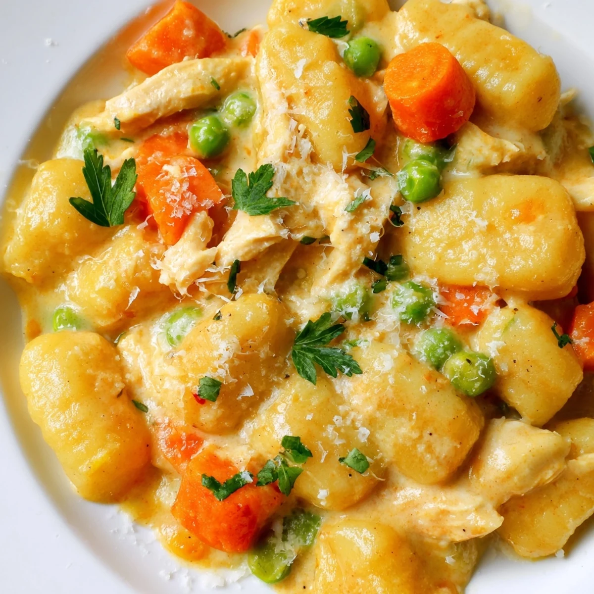 This hearty one-pot dinner combines tender shredded chicken, soft potato gnocchi, and classic pot pie vegetables in a luscious cream sauce. The gnocchi cook directly in the flavorful broth, absorbing the savory flavors while creating a naturally thick, velvety texture. Ready in under an hour, this comforting meal brings all the cozy vibes of traditional chicken pot pie without the fuss of making pastry crust.