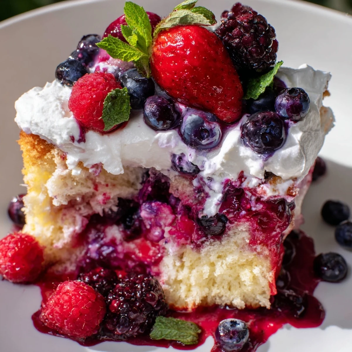 This luscious dessert starts with a moist vanilla cake baked to golden perfection. While still warm, create wells throughout the cake and pour a homemade mixed berry sauce—made with strawberries, blueberries, raspberries, and blackberries—into every crevice. The vibrant sauce seeps deep into the cake, creating pockets of fruity sweetness in every bite. After chilling to let the flavors meld, top with clouds of freshly whipped cream sweetened with powdered sugar and vanilla. Garnish with fresh berries and mint for a stunning presentation that's perfect for summer celebrations.